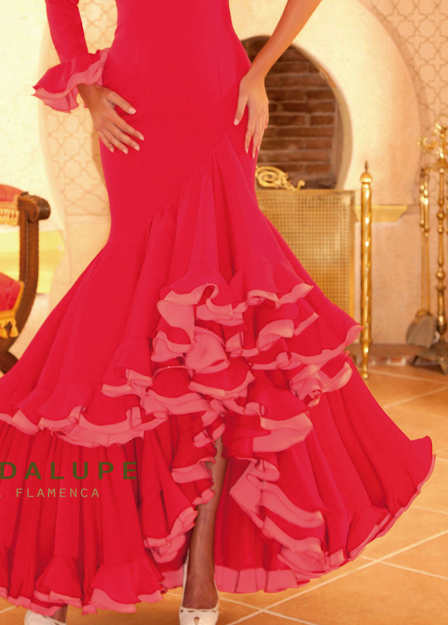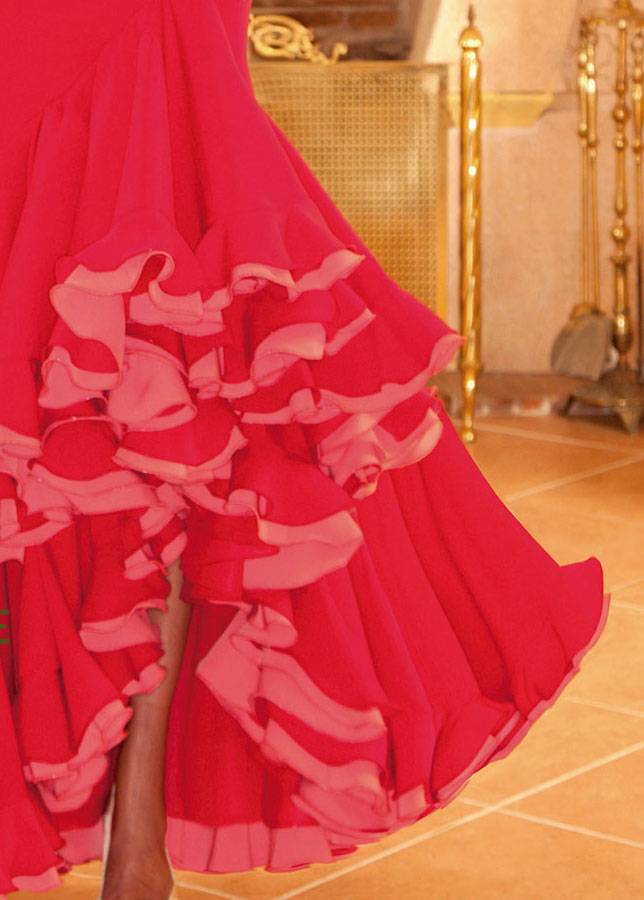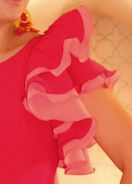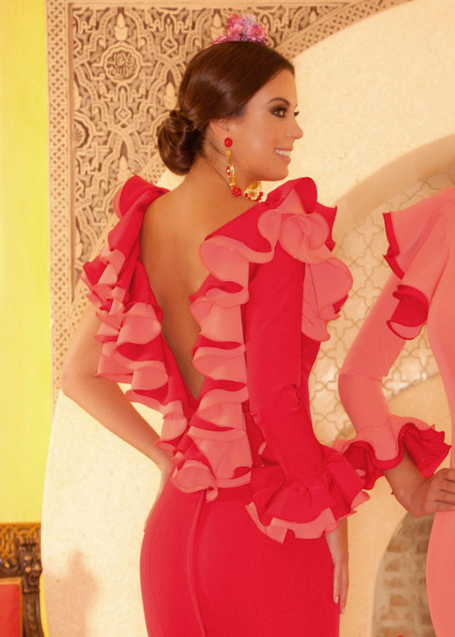 肩口から背中側につながった大きなフリルに片側のみの袖、動きによって足元を覗かせる前上がりのファルダと、とても大胆で目を惹くデザインです。