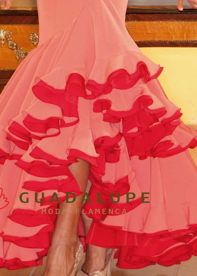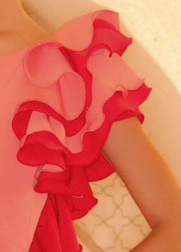 肩口から背中側につながった大きなフリルに片側のみの袖、動きによって足元を覗かせる前上がりのファルダと、とても大胆で目を惹くデザインです。