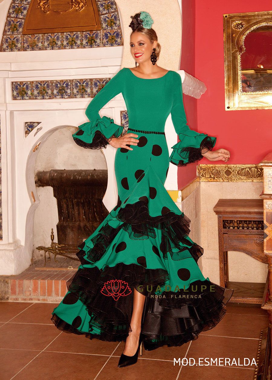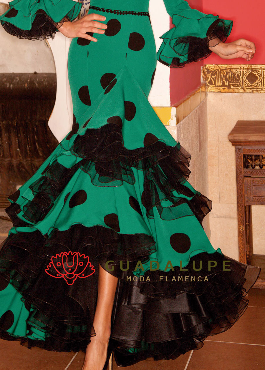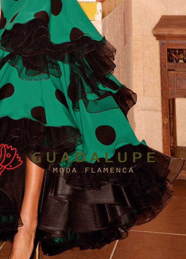 エメラルドのような緑色と黒のモダンな配色にフラメンコらしい大きな水玉柄のワンピースです。