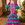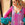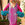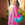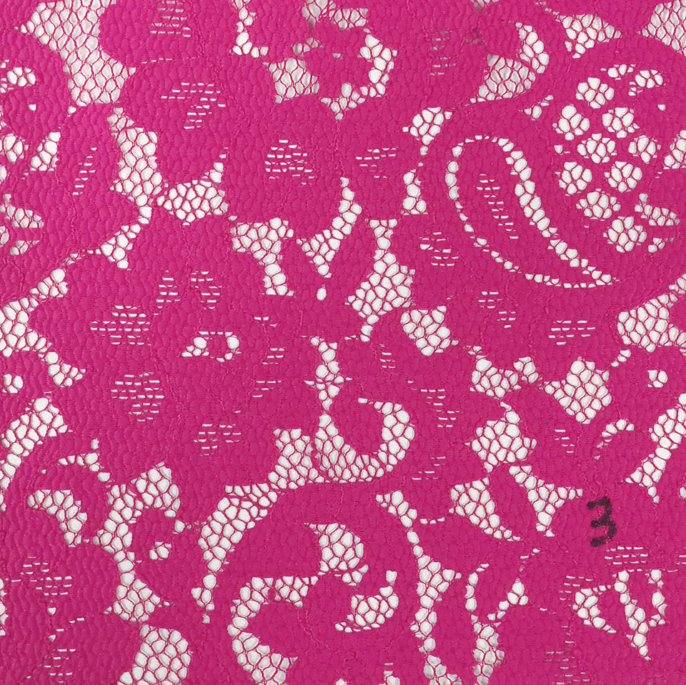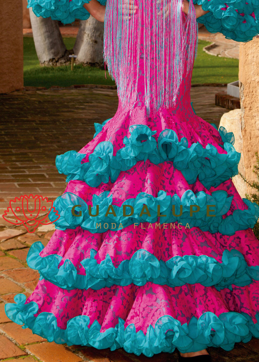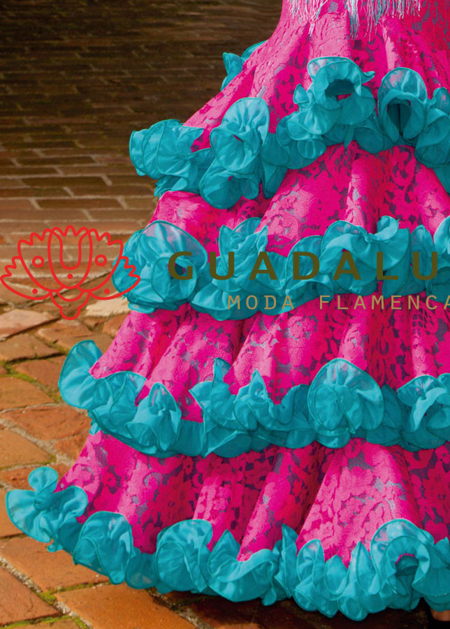 フシアピンクのレース生地にボリューミーなターコイズのシフォンフリルをあしらった、豪華な総レースのワンピース。