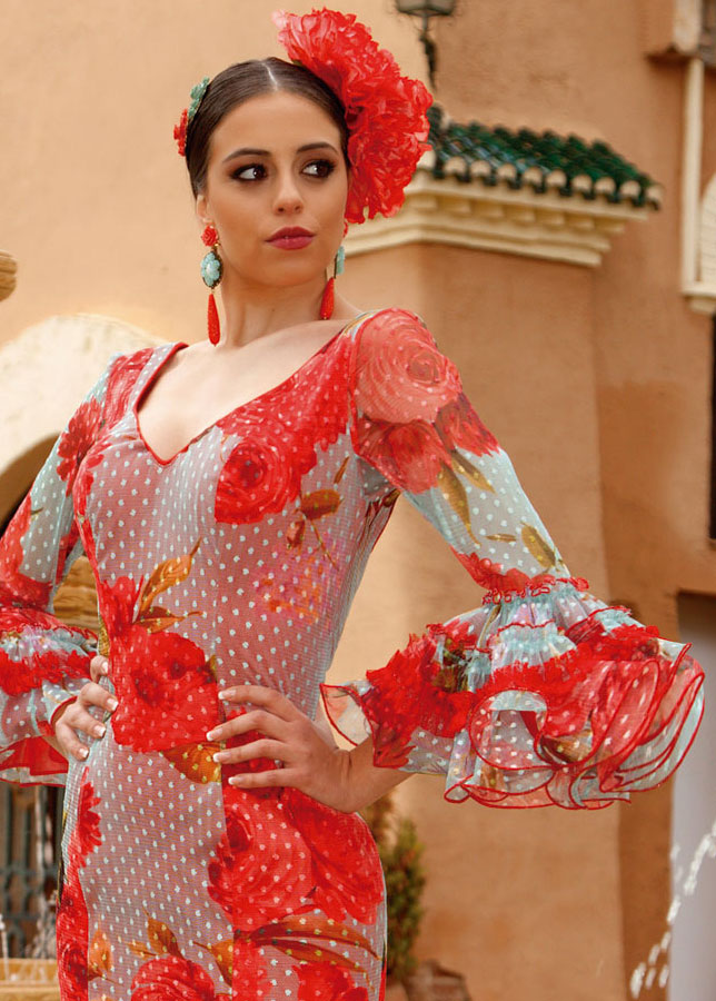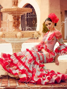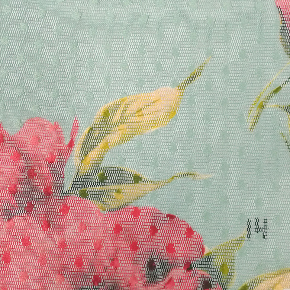 水玉刺繍チュールに大振りの花柄プリントをあしらった総レース仕様のティアードタイプワンピース。