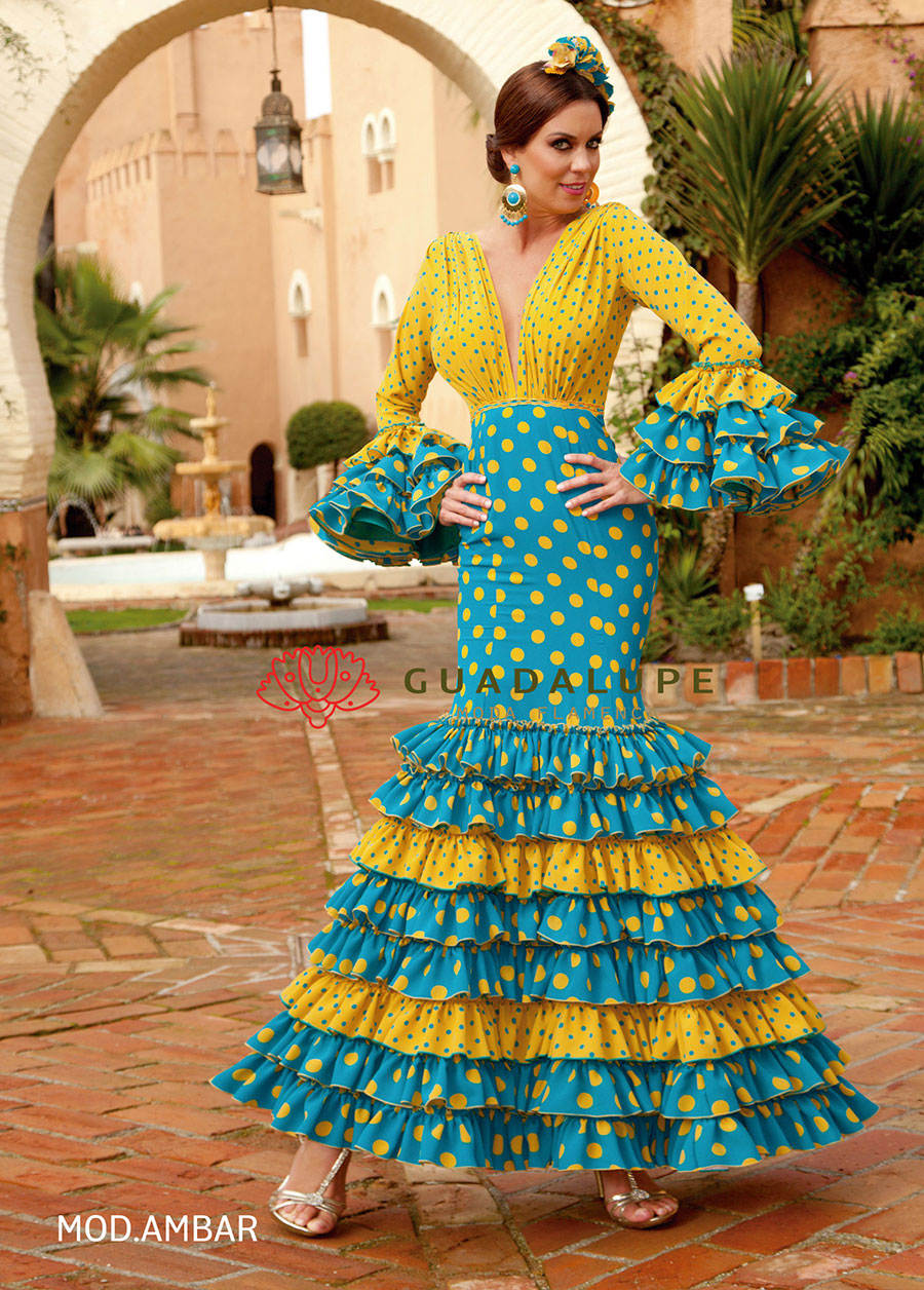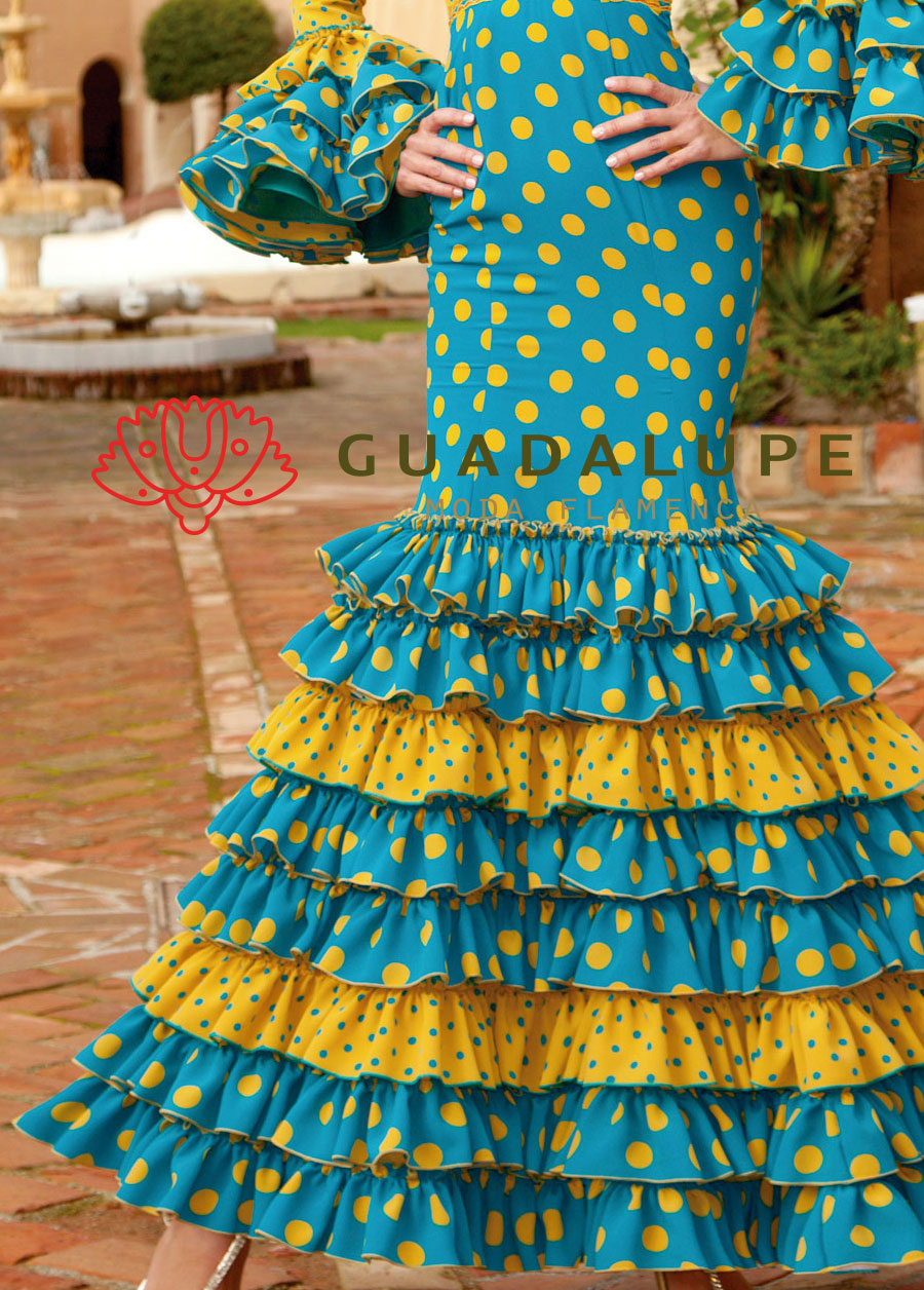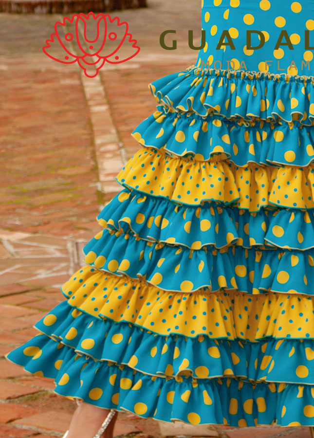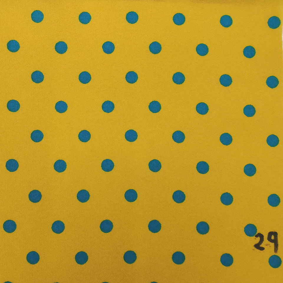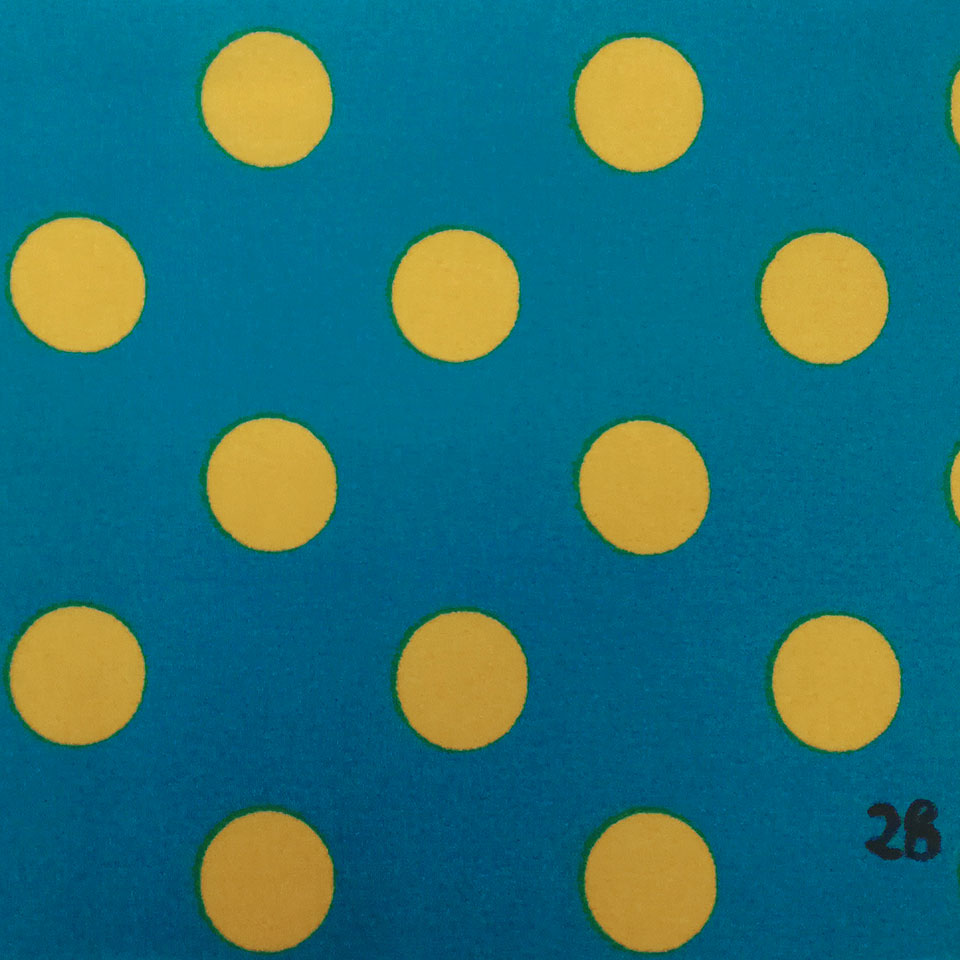 マスタードイエローと濃いターコイズブルーの水玉柄がポップで楽し気な雰囲気のワンピースです。